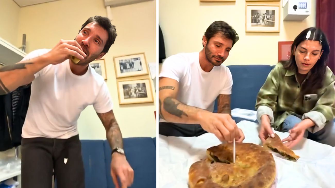 Emma e Stefano De Martino: ex fidanzati e oggi amici fraterni, dietro le quinte di Stasera Tutto è Possibile gustano la pizza di scarole.